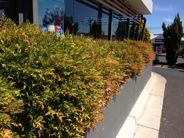 I am always looking for hedging plants that don't need to be pruned. There are very few available but I did find a great hedge of Nandina Moon Bay growing at McDonald's in Cooma on the weekend. This relatively new plant only grows 75cms high by about 60cms wide. It is very easy to grow and once established it will survive heat, cold and drought. Just remember though once you plant them in a pot or a window box they will need to be watered often.