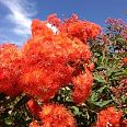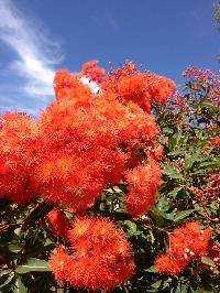 You may have noticed that Dwarf Eucalyptus ficifolia are flowering around Macarthur. These dwarf versions of the famous Western Australian Flowering gum are perfectly suited for today’s courtyard sized gardens. They have recently had a name change to Corymbia ficifolia. They come in Red, Orange, Pink and white flowering versions. These are all available at different times of the year at Tim’s. There is a fantastic orange flowering tree growing in the motel next door to our nursery. They bought this off us about 5 years ago. It is only about 2.5 metres high. It will grow about 5 metres high once established. They really are amazing looking trees. You need to be careful when you first take them home. Dunk them in a bucket of water prior to planting and water every day for at least a month. After that a bucket of water twice a week will get them established. Gardeners think that Eucalypts don’t need to be watered. These grafted varieties are not cheap so you need to nurture them at the start. In Western Australia these trees would send roots down into the sand until they found water. In Macarthur the roots hit the clay and stop so that’s why you need to water them. They also do much better if you plant them on a mound of native potting mix.