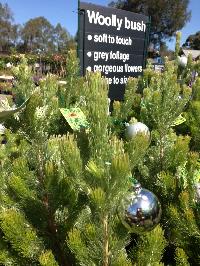 If you would prefer a potted Christmas tree we have an Australian native plant called a Woolybush. This has beautiful soft grey foliage. It also gets red spidery looking flowers that the birds love. We have nice plants that could be sat on a table inside to make them look bigger. After Christmas you can’t just put the pot outside in the full sun or the plant will get sun burnt! Place it in a morning sun position for at least a couple of weeks before moving into the hot sun. Woolybush is such an interesting looking plant. Come and feel the foliage you will love it. They grow wild near the coast in Albany Western Australia. The variety we have grows up to 2 metres high by 1 metre wide. They can be pruned to size.