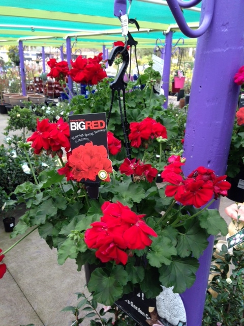 We are having great success with a new Geranium plant called ‘Big Red’. We have these in hanging baskets here at the nursery and they have been flowering all winter.