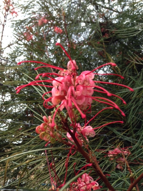 It is called Grevillea Ellegance and it hasn’t stopped flowering for 20 years or more. It has grown into a small tree about 6 metres high by 6 metres wide.