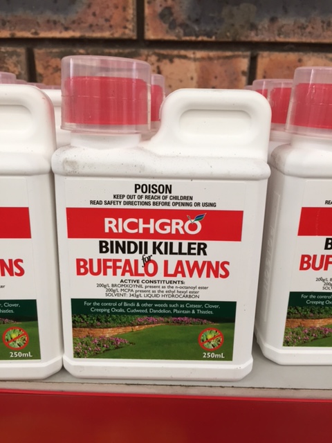 We've had great success with Richgro Bindii Killer for Buffalo Lawns. It's safe for all types of grass. Use it at the 30mls per 5 litres of water and add a squirt of dish washing liquid. Spray this over 50 square metres.