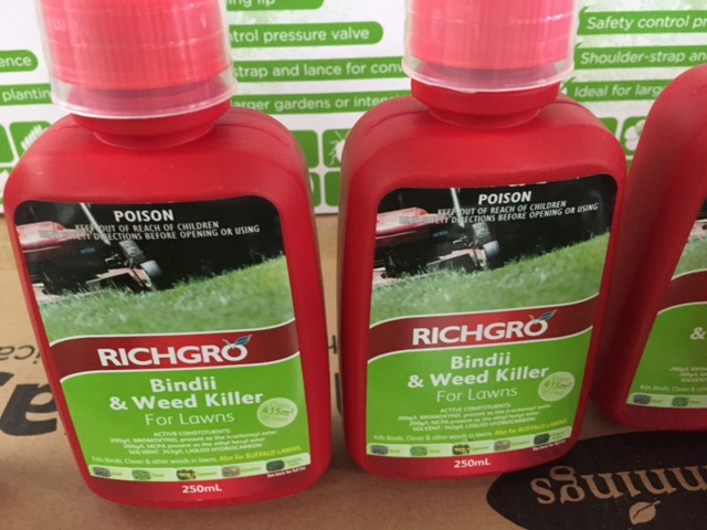 If you don't own a sprayer come and see us. We have a new 5litre sprayer for just $18.99. We use "Richgro Bindii & Weed Killer for Lawns" to control Clover and Bindii. This is safe to use on all types of grass including Soft Leaf Buffalo. Spray twice in 7-10 days to kill most broadleaf weeds. Add a squirt of detergent to the water for best results. Don't mow for 7 days before or after spraying. If you only spray once the Clover will come back.