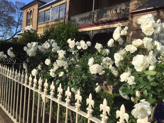 I drove up Hill Street in Camden during the week and spotted these spectacular White Iceberg Roses. These heritage houses on top of the hill, have been beautifully landscaped, and the White Iceberg Roses were really putting on a show. This rose was first released in 1958 by Kordes in Germany and it is still the biggest selling white rose today.