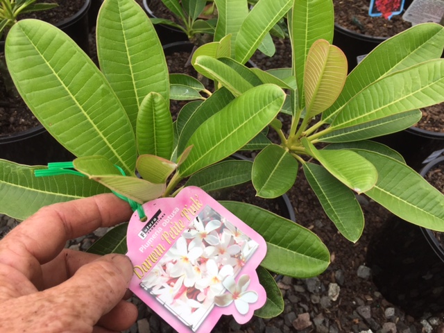 We have a dwarf Frangipani called Darwin Petite Pink. This evergreen variety has smaller leaves and a more compact shape making it perfect for smaller gardens.
