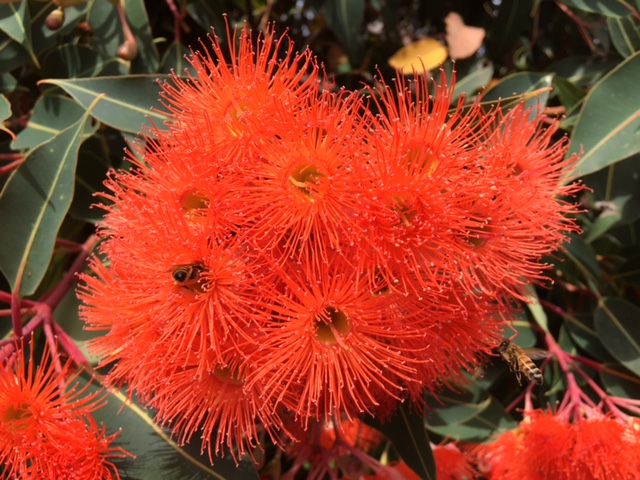 I spotted this beautiful dwarf growing flowering gum in the front yard of a house in Elderslie last week. The house was actually for sale and I think this tree could add an extra $10,000 to the value of the house. The bright orange flowers were amazing. The Native birds and bees were having a lovely time collecting the nectar.