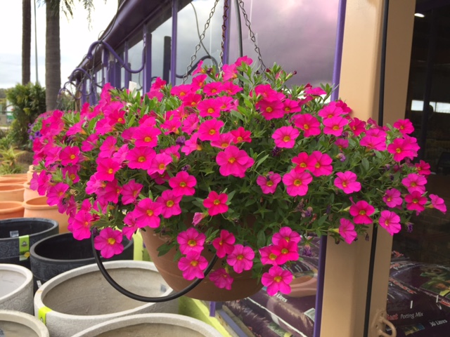 Our hanging baskets are looking sensational for Christmas. We planted these up just a few weeks ago using Tim's Best Potting mix. These Calibrachoas really are amazing. This variety is called Callie Pink and we have them in the nursery for just $16.99. You only need one plant per pot or hanging basket. They can be grown in the garden too but they seem to grow much better in pots. Our baskets are watered via a drip irrigation system that has been installed in the gutter.